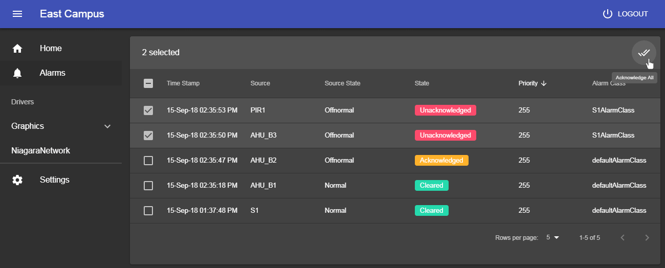 The Advanced Alarm Acknowledge Table shows the current and historical alarms in the station in a responsive table which updates in real-time. Unlike our